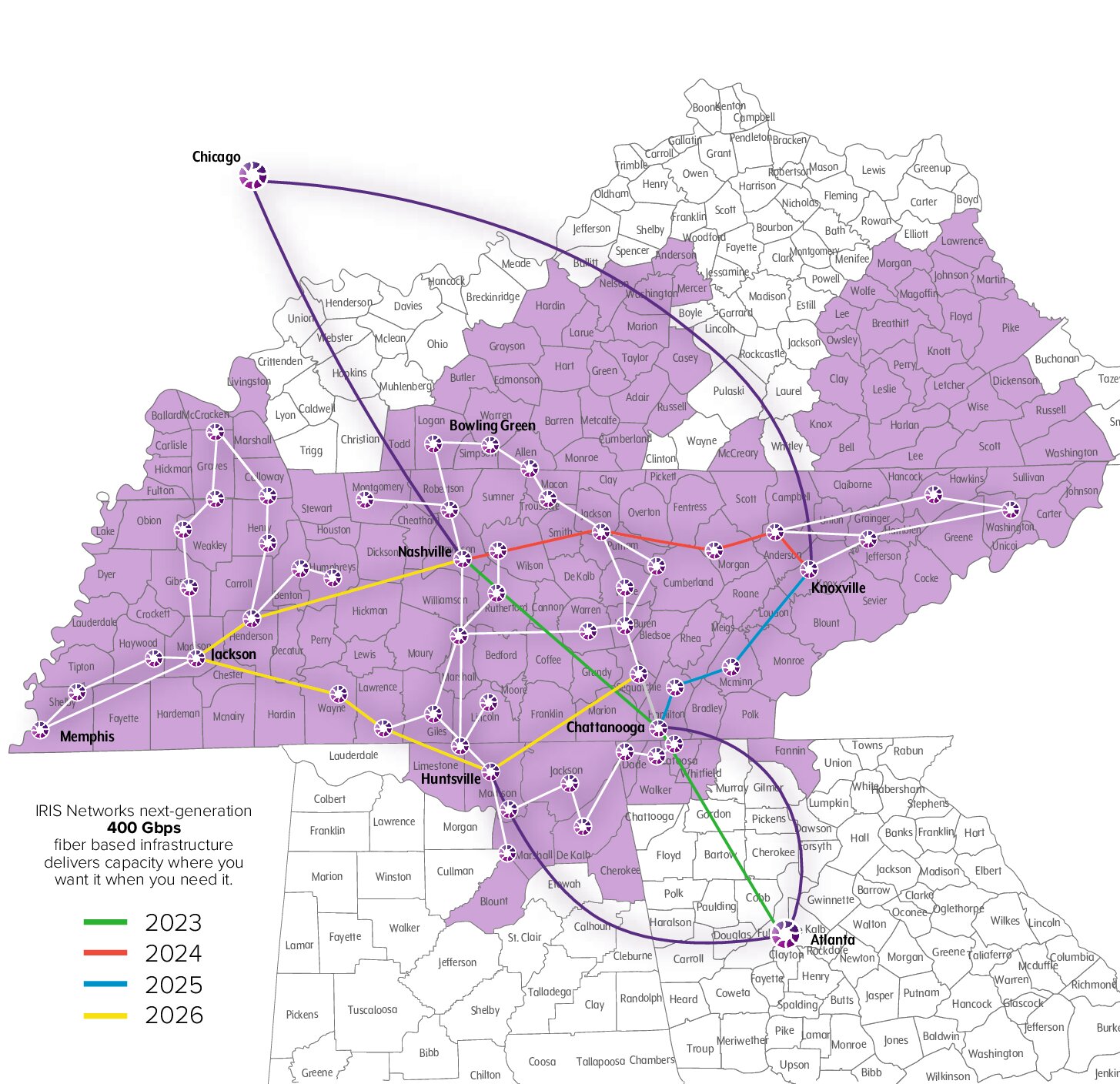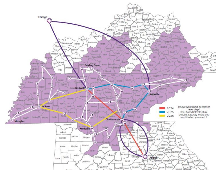 Designed to support and accelerate the pace of innovation in Tennessee and the region, IRIS Networks delivers a world-class fiber network, robust middle-mile, and extensive broadband access. We reach over 250 communities and connect Alabama, Georgia, Kentucky, Virginia, and beyond.